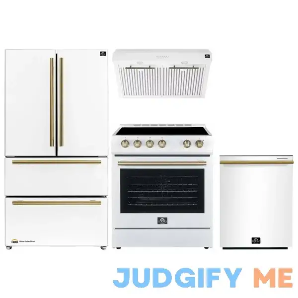 Customers love the Forno Espresso 4-Piece Appliance Package for its stylish design and sleek appearance. Many users mention that the white finish with brass handles adds a touch of elegance to their kitchen. The electric range is praised for its cooking performance, with users highlighting its precise temperature control and even heat distribution. The refrigerator and dishwasher are also well-received, with customers noting their spacious interiors and energy efficiency.